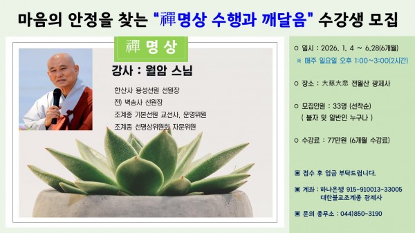 마음의 안정을 찾는 “禪명상 수행과 깨달음” 수강생 모집합니다.
